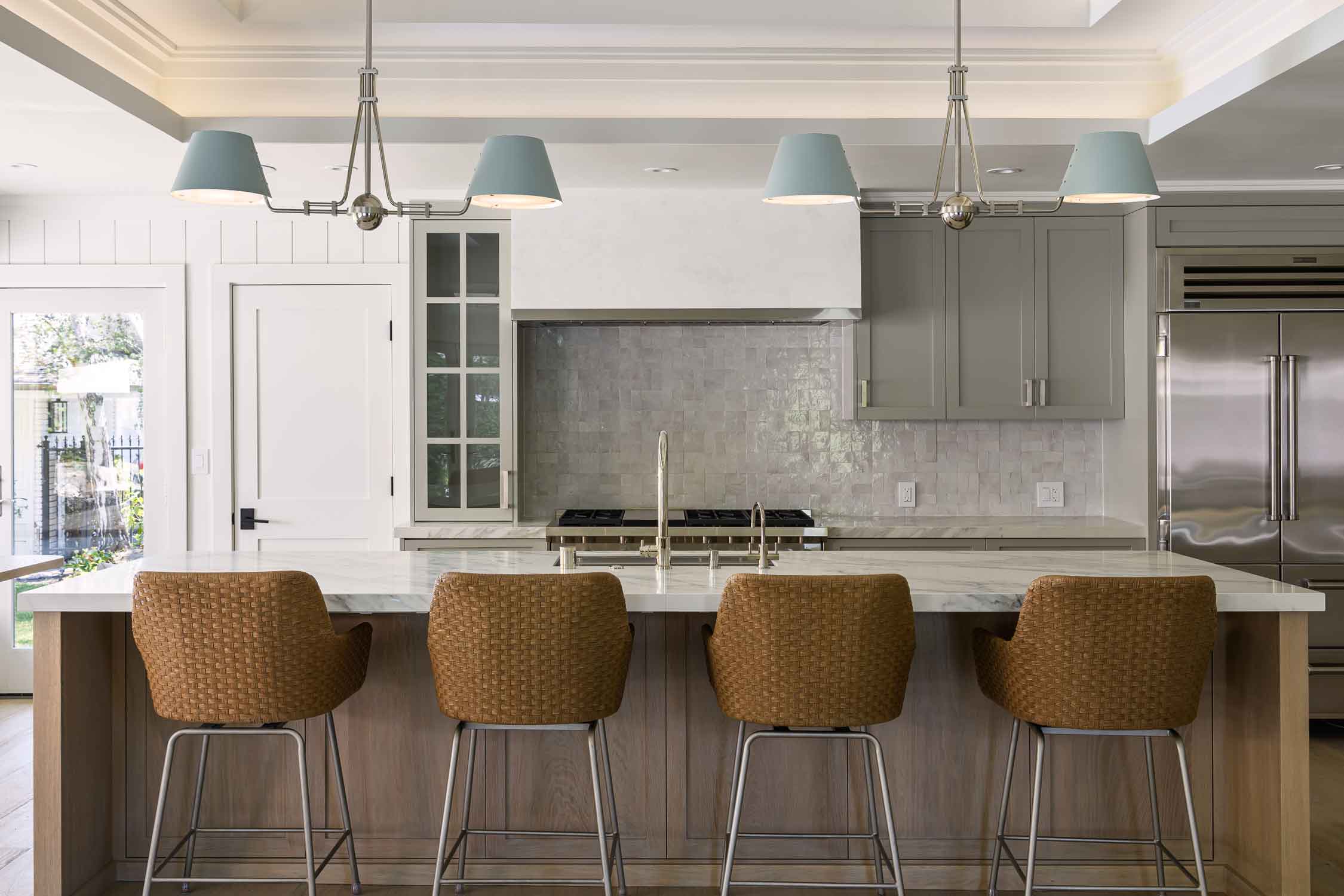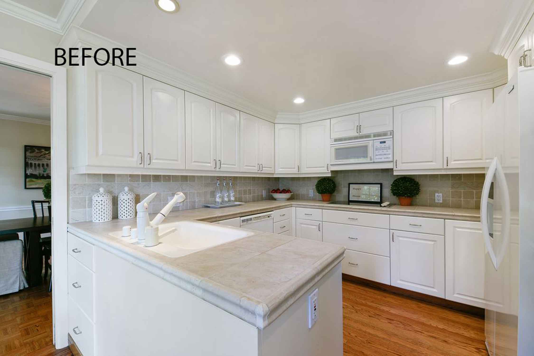 The kitchen suffered from a poorly designed island which took up much otherwise useable floor space.  Replacing that island with a gorgeous, double-waterfall edged peninsula opened up that floorplan allowing for improved flow.  We removed the soffited ceilings allowing us to install taller cabinetry to create a feeling of height and light.  Also, we removed a portion of wall between the kitchen and formal living room (and raised the living room floor) which served to create a lovely transition between rooms.