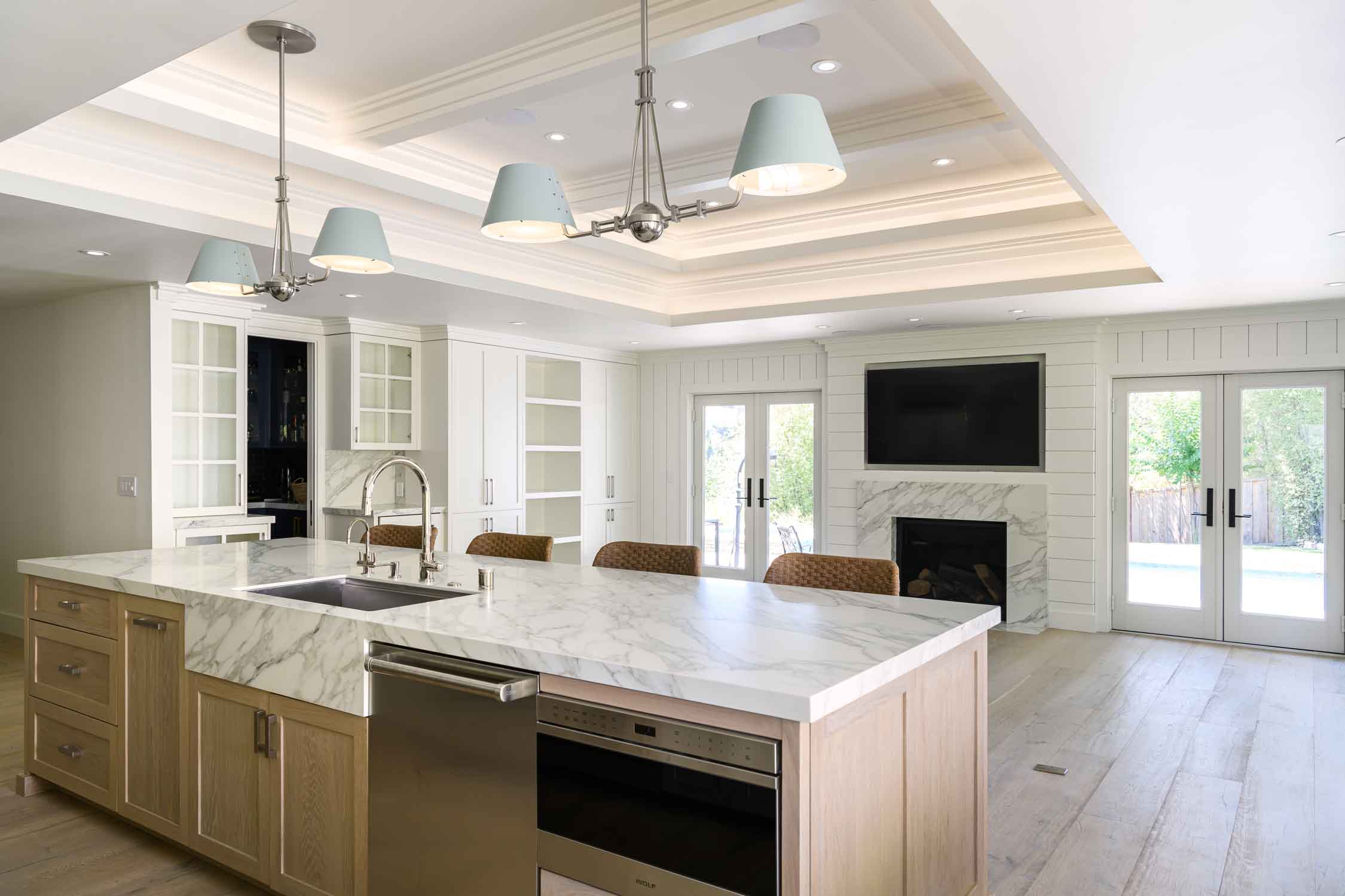 Removing family and dining room walls opened up the floorplan creating a wow-factor gathering space for family and friends.  The beautiful built-ins provide an elegant and practical solution for extra kitchen storage.