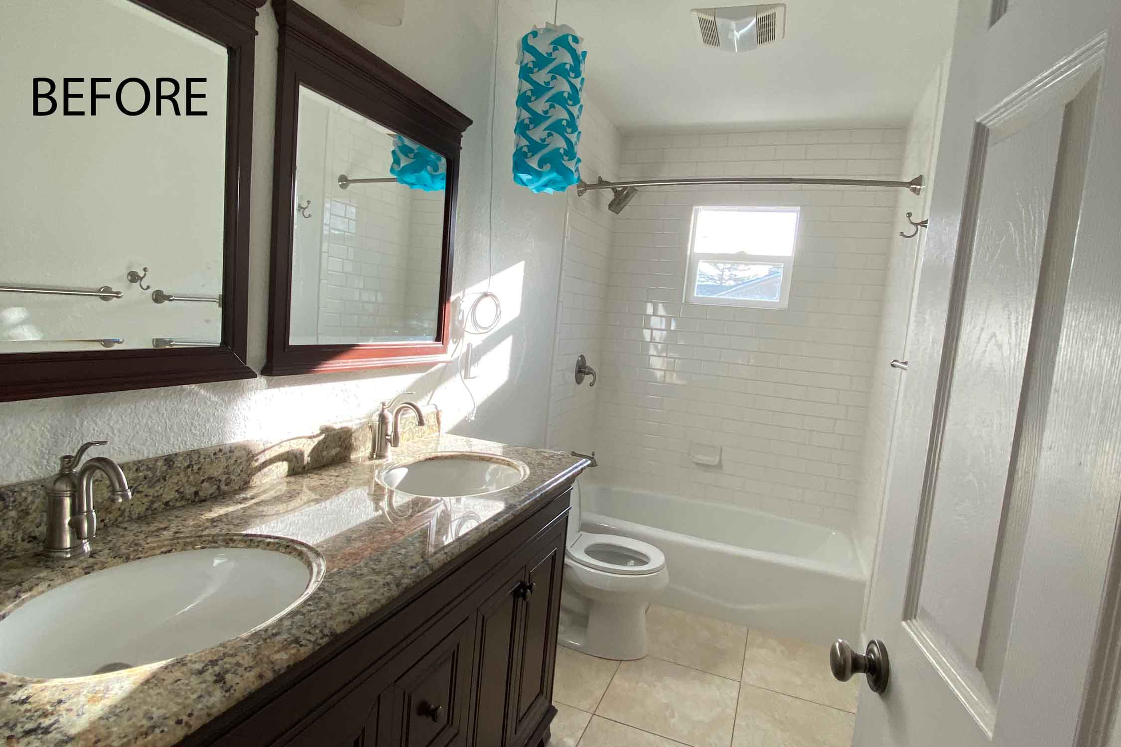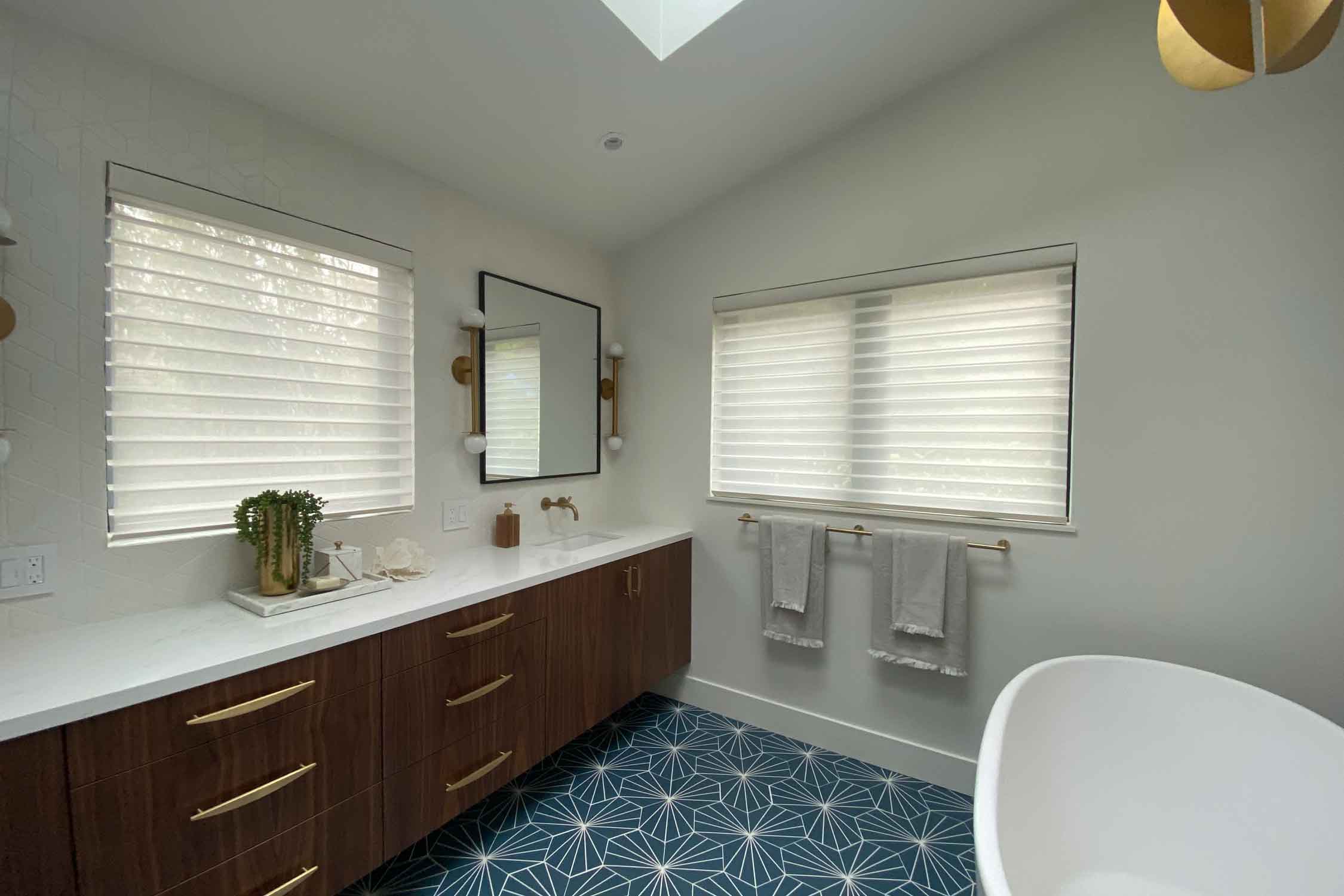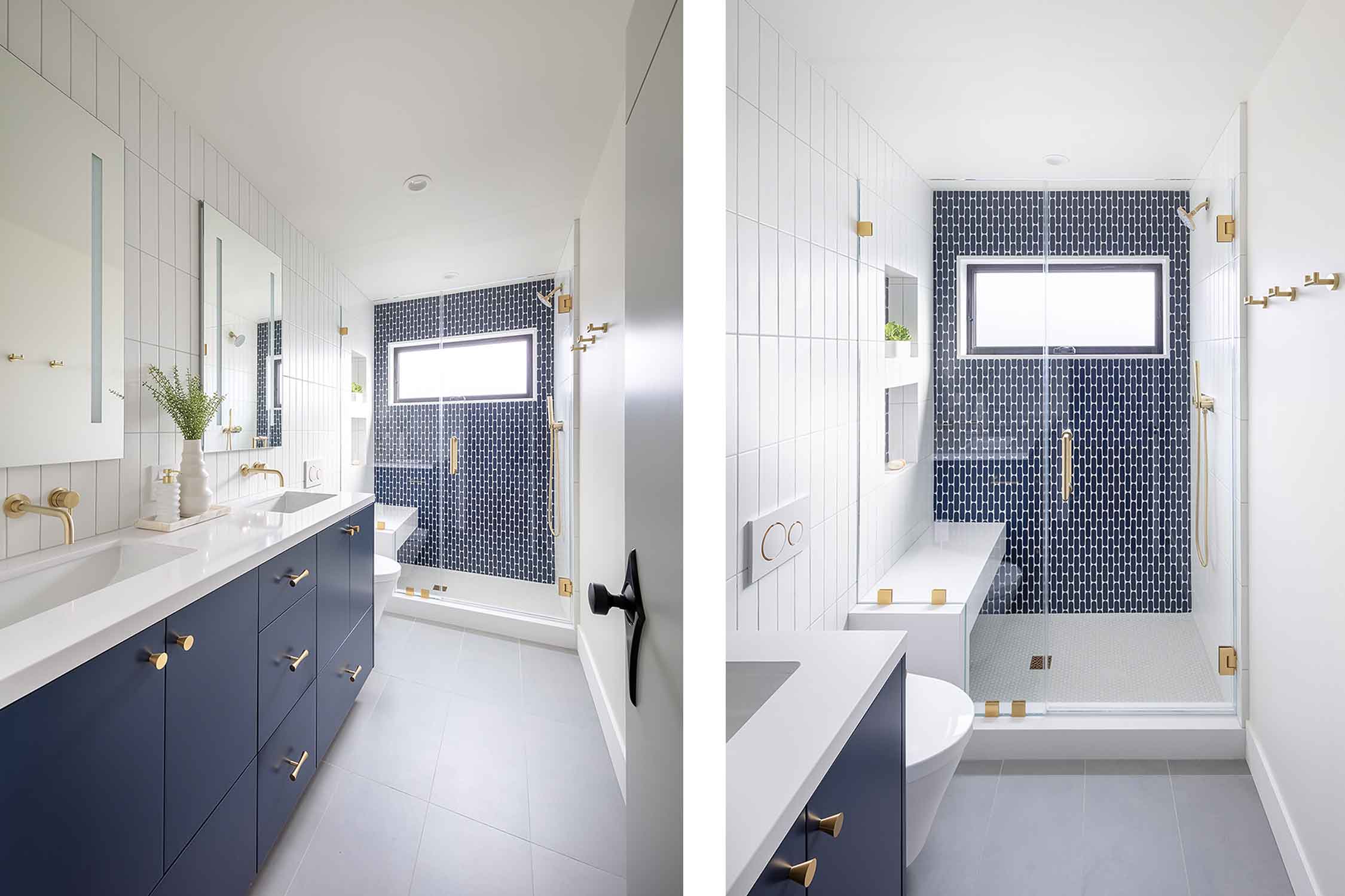In the same whole-house remodel, with the mid-century modern theme, the boys’ bathroom creatively made the best of a small space and gave the young men plenty of room.