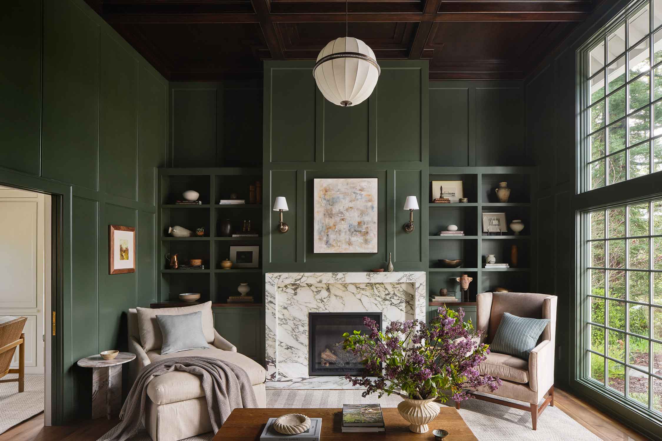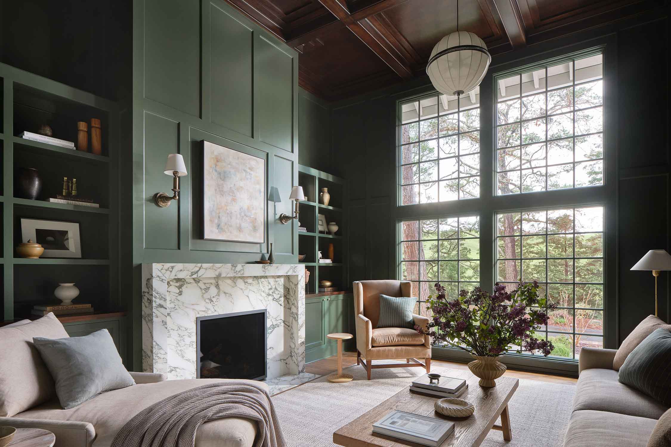 On this lovely great room, our clients were seeking old world charm and sophistication with the warmth befitting a family home.  The size of the room and the natural light allowed for the use of the darker wall and ceiling colors while still preserving an appealingly lit space.  This is a stunning example of reimagining a dated space.  This home remodel was published in Rue Magazine, online, HOME TOURS / AUGUST 19, 2025