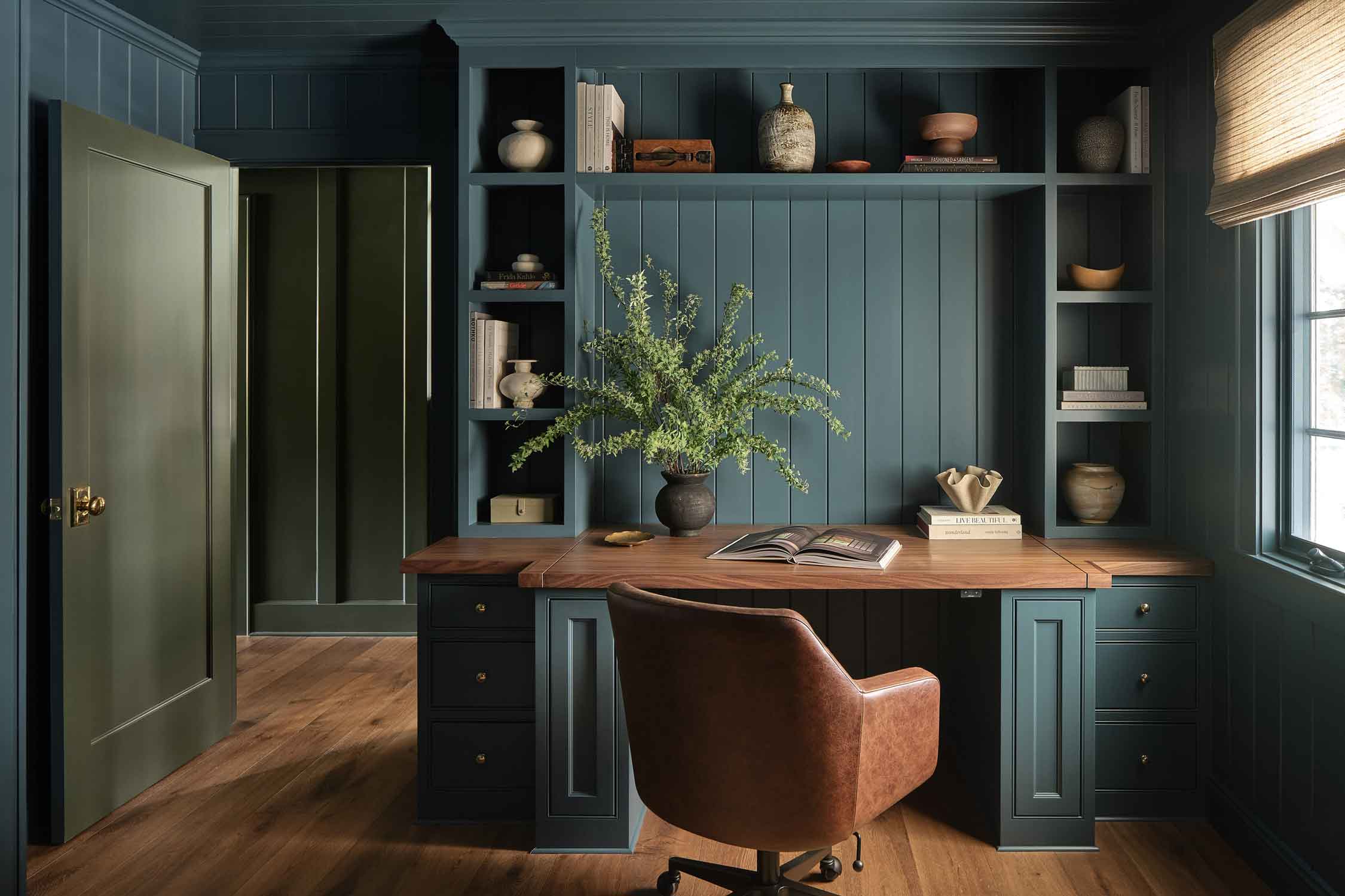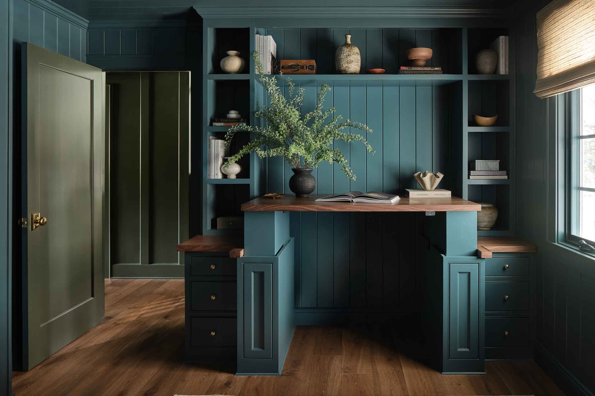 A cozy and very functional workspace.  A stand up desk option and a Murphy Bed installation provide versatility for this office/guest space.