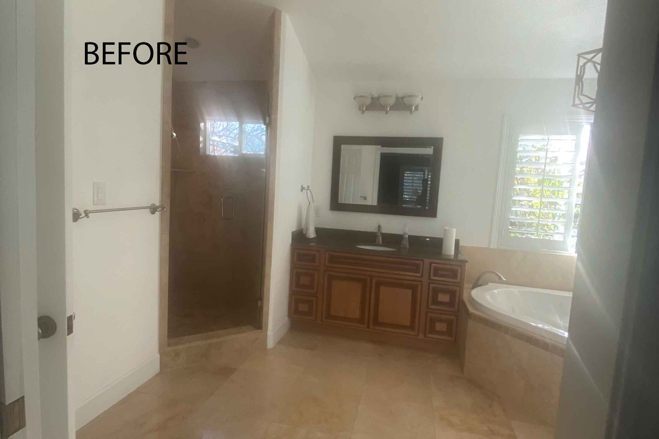 To satisfy the desire of our clients to obtain a “fancy, private spa” feel to their master bathroom, we removed that old bathtub, and replaced it with a beautiful, freestanding bathtub as well as enlarging the shower.  Shifting and replacing both bathroom windows in order to balance the light over the bathtub and shower created a space any tired, well-traveled person would be happy to enjoy.  New cabinetry, finishes and design elements completed the epic update to this formerly lackluster space.