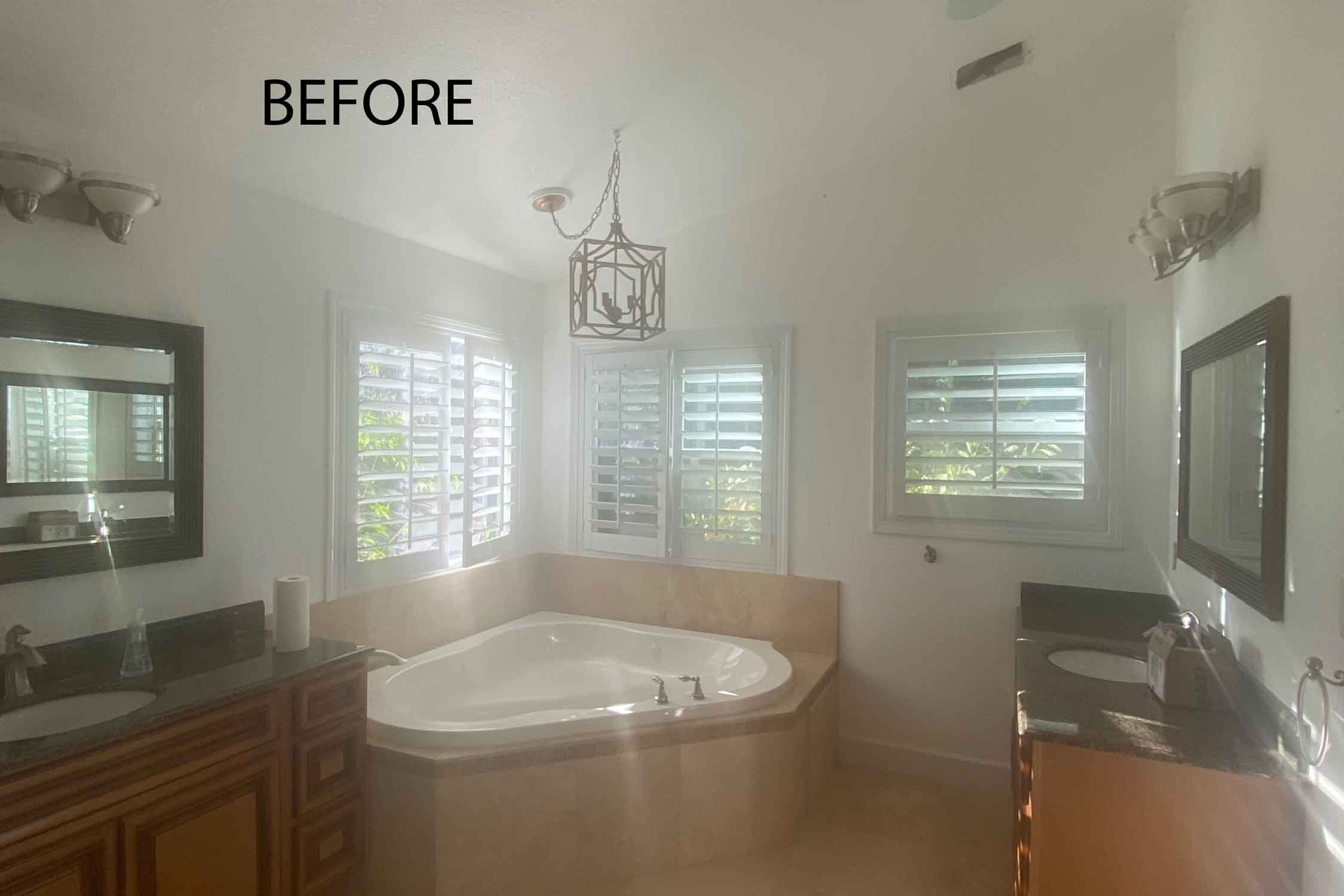There was nothing fundamentally wrong with this bathroom; it was simply very average and had a 20-year-old feel to it.  The lighting did it no favors, nor the small shower and deck-mounted tub.